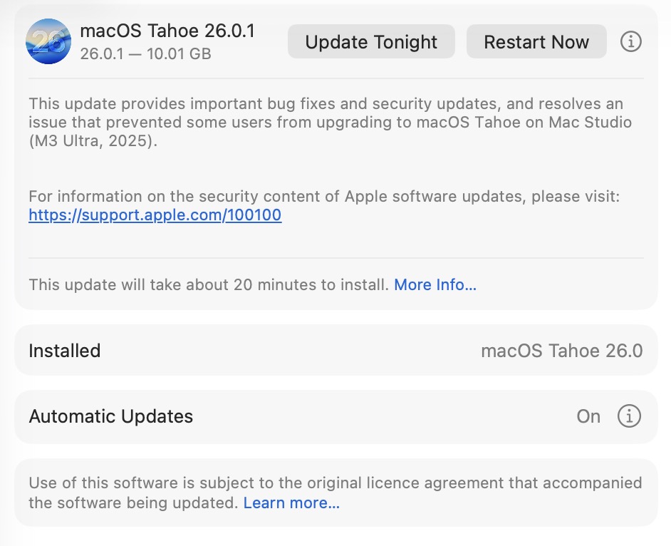 Regarding the macOS Tahoe 26.0.1 update, its size is pointed out to be 10.01 GB. Bug fixes and security updates are part of this update too, and its changelogs mention that it will be resolving the issue that prevented Mac Studio – M3 Ultra 2025 model users from upgrading to macOS Tahoe.