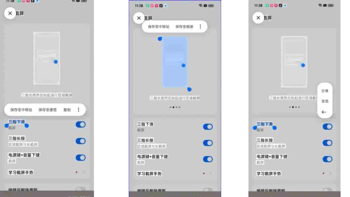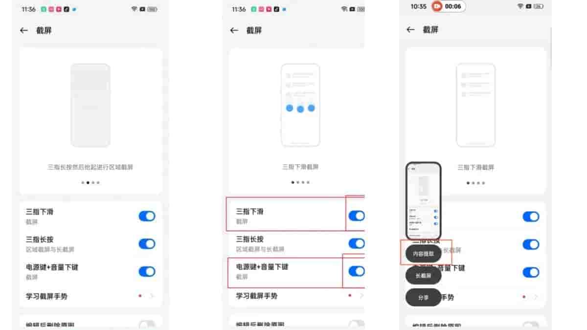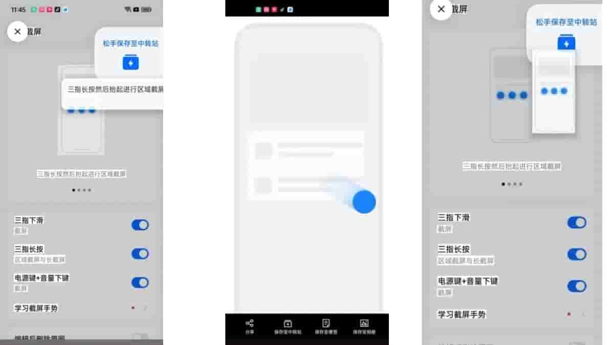 - Turn on the three-finger slide switch or turn on the power key + volume down key switch