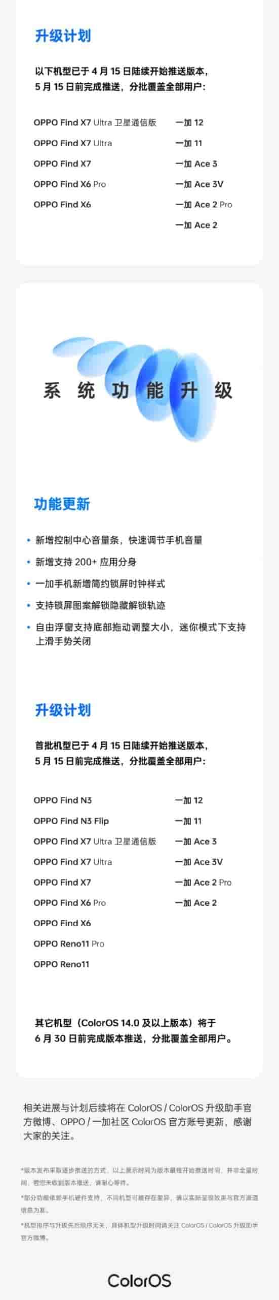 Other models (ColorOS 14.0 and above) will complete the version push before June 30 and cover all users in batches.
