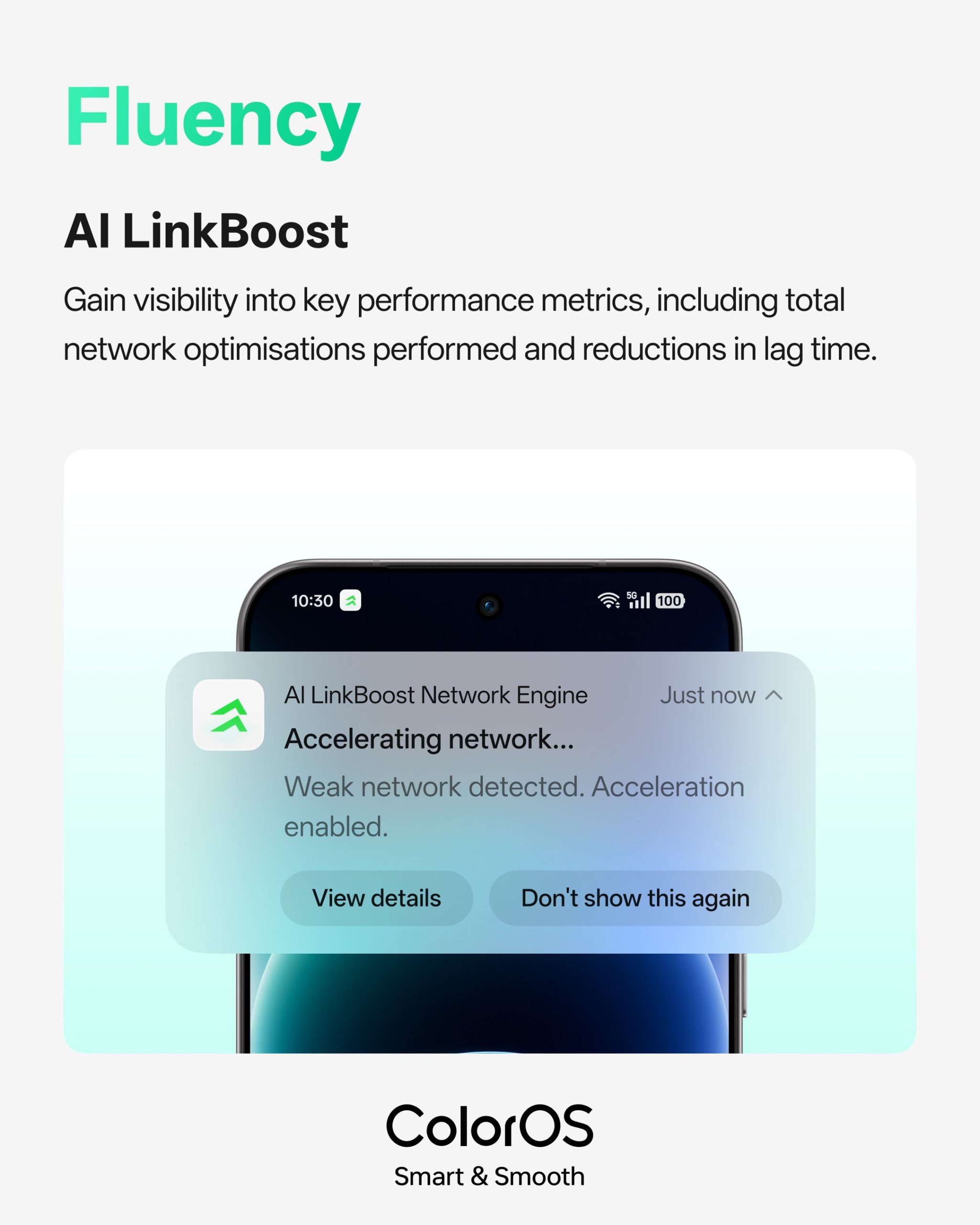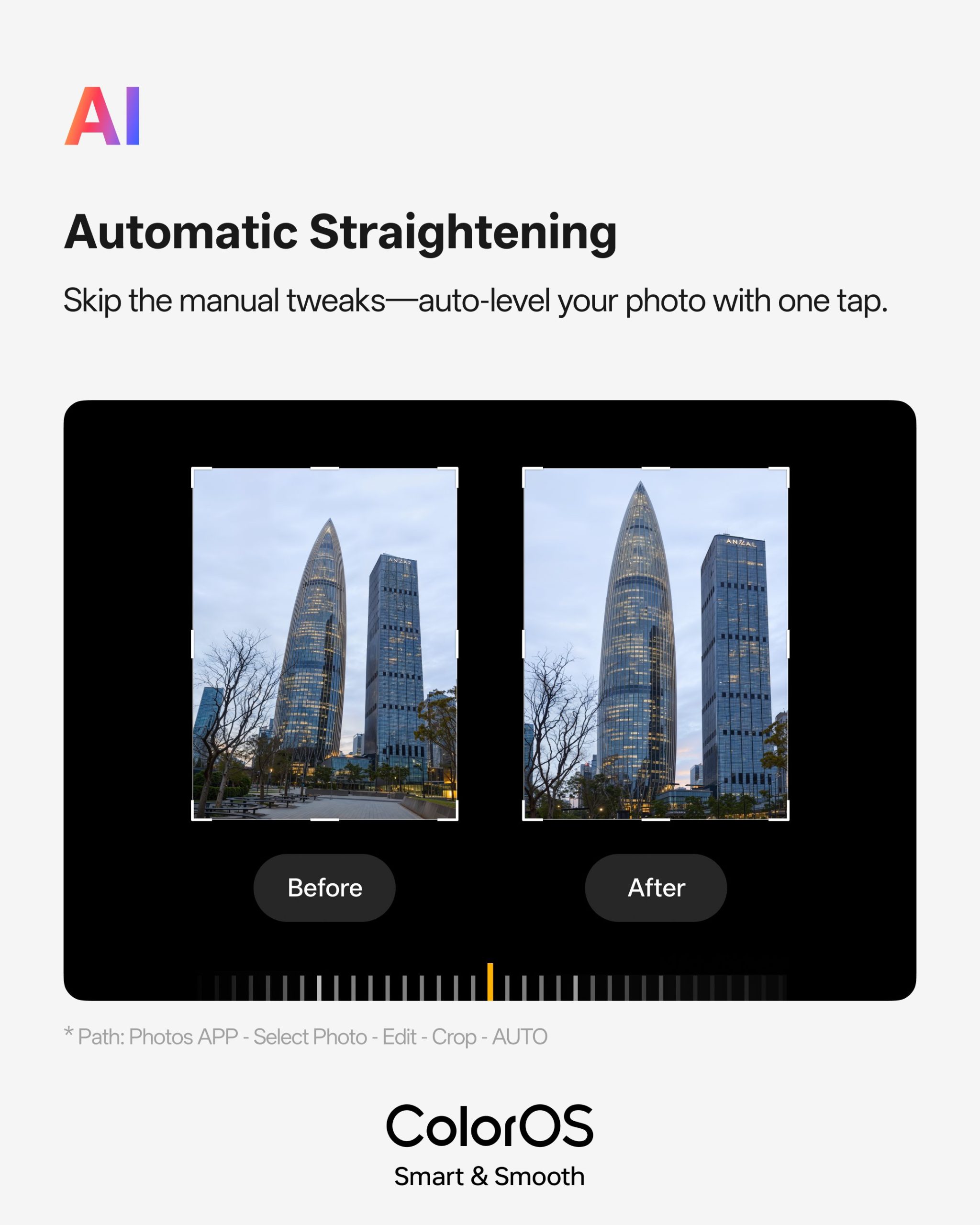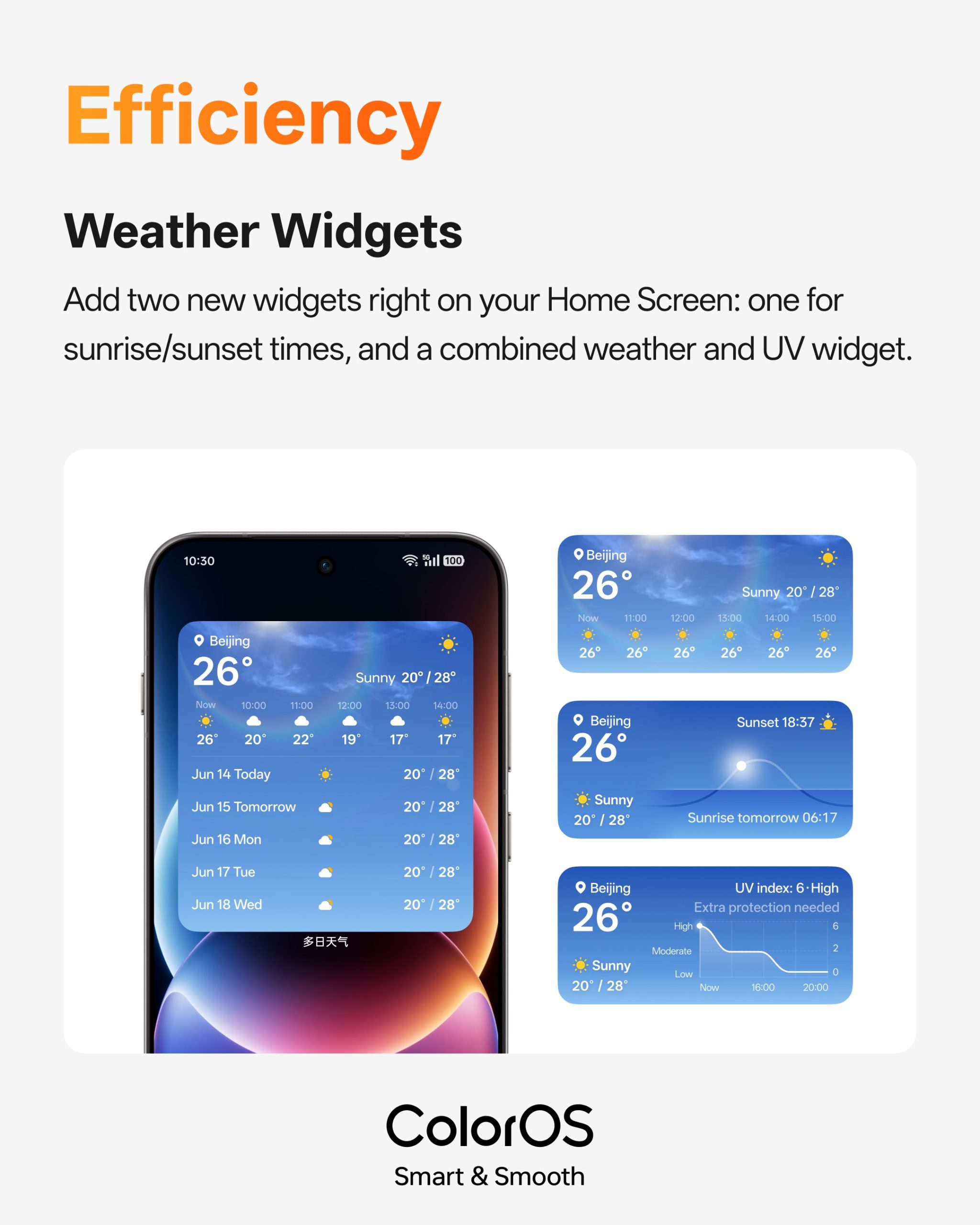 Notably, this ColorOS November 2025 update is focused on three aspects – Fluency, Efficiency, and AI. In terms of fluency, features like AI LinkBoost and Clock Size Control have been added, offering the visibility into performance metrics and the capability to adjust the clock size in selected Flux themes. The efficiency of the Weather app has also been enhanced bringing two new widget – for sunrise/sunset times and for a combined weather and UV data. About the AI feature, with the Automatic Straightening capability, users will easily be able to level the photo.
