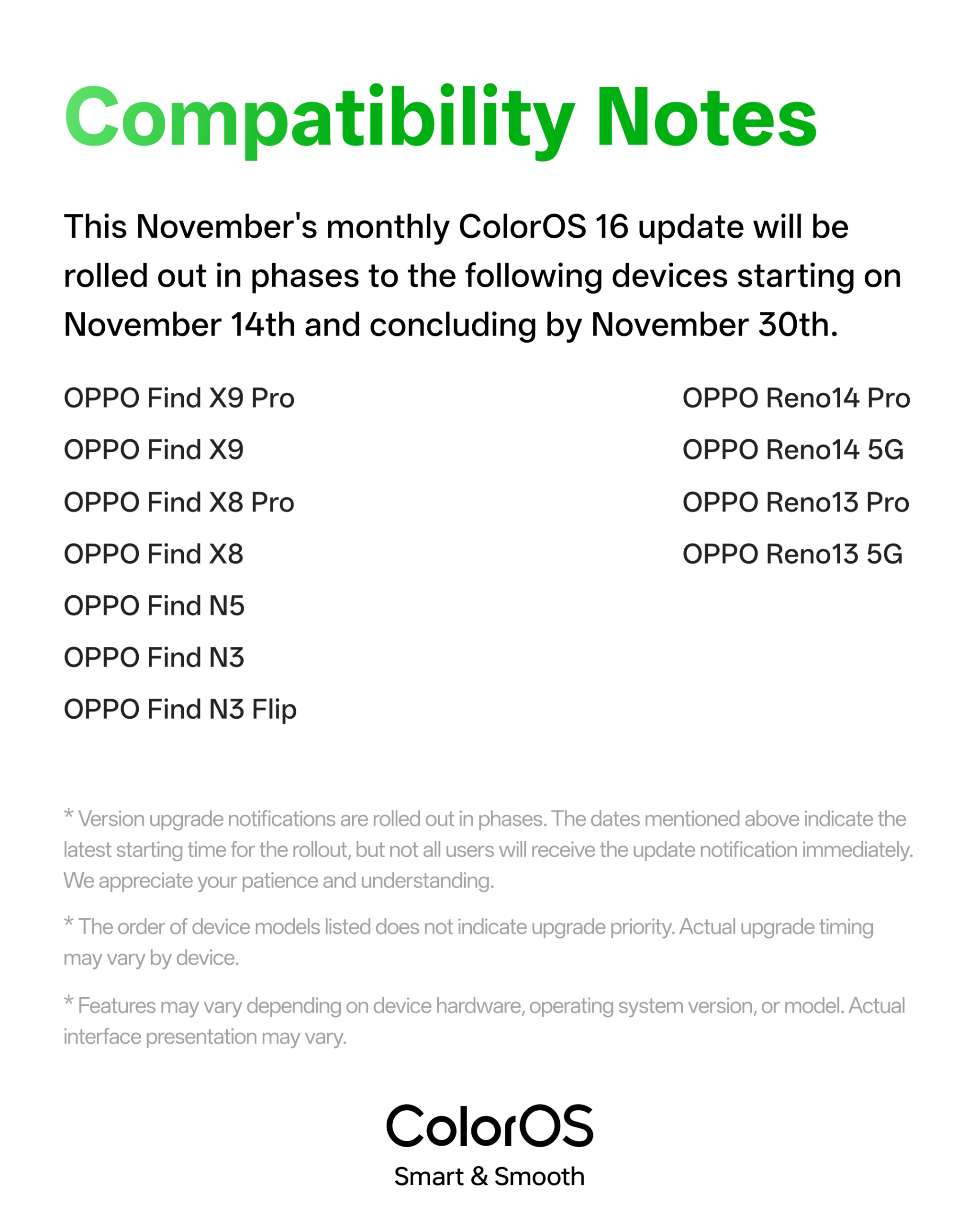 ColorOS November 2025 Update Now Rolling Out for Global Audience: Find X9 Series, Find X8 Series, Find N5, Find N3 Series, Reno 14 Series, and Reno 13 Series Now Receiving it
