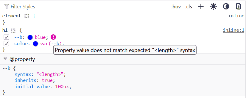 The Inspector panel now flags a custom property declaration as invalid when the value does not match the registered custom property definition. As shown in the screenshot below, the declaration of a custom property, --b, expecting a <length> value syntax (e.g., 10px), is instead used with a color specified. An exclamation icon appears next to it with a tooltip explaining the error.
