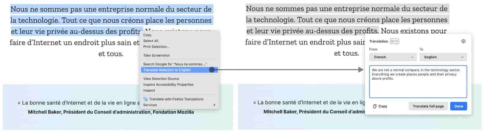 The first feature is the ability to translate any highlighted text to any other language of your choice. To do this, select the text from the webpage and right-click. A new menu will open up; from there, select “Translate to English.” A new pop-up window will appear, and you can select the language in which you would like the results to be displayed. This feature was already available in Google Chrome and is now coming to Firefox.