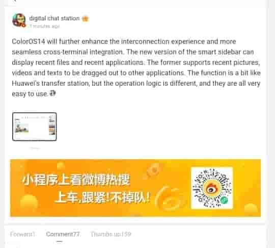 According to the tipster the ColorOS 14 upgrade will be enhancing the intercommunication experience of the users and also seamless cross-terminal integration. As revealed in the Weibo post, the new version of the smart sidebar will help in displaying recent files and recent applications. While this new version will be supporting recent pictures, videos, and text to be dragged out to other applications.