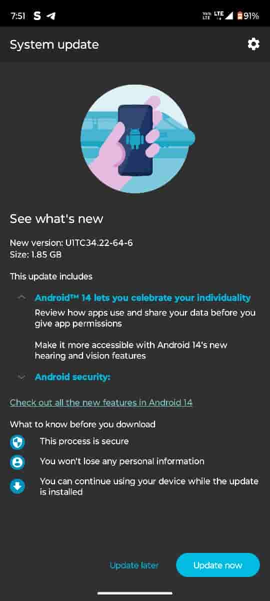 The update arrives with firmware version- UTC34.22-64-6 and the size of the update is 1.85GB. It integrates the February 2024 security patch into the device. Other than this Android 14 OS also arrives with some amazing features and improvements-