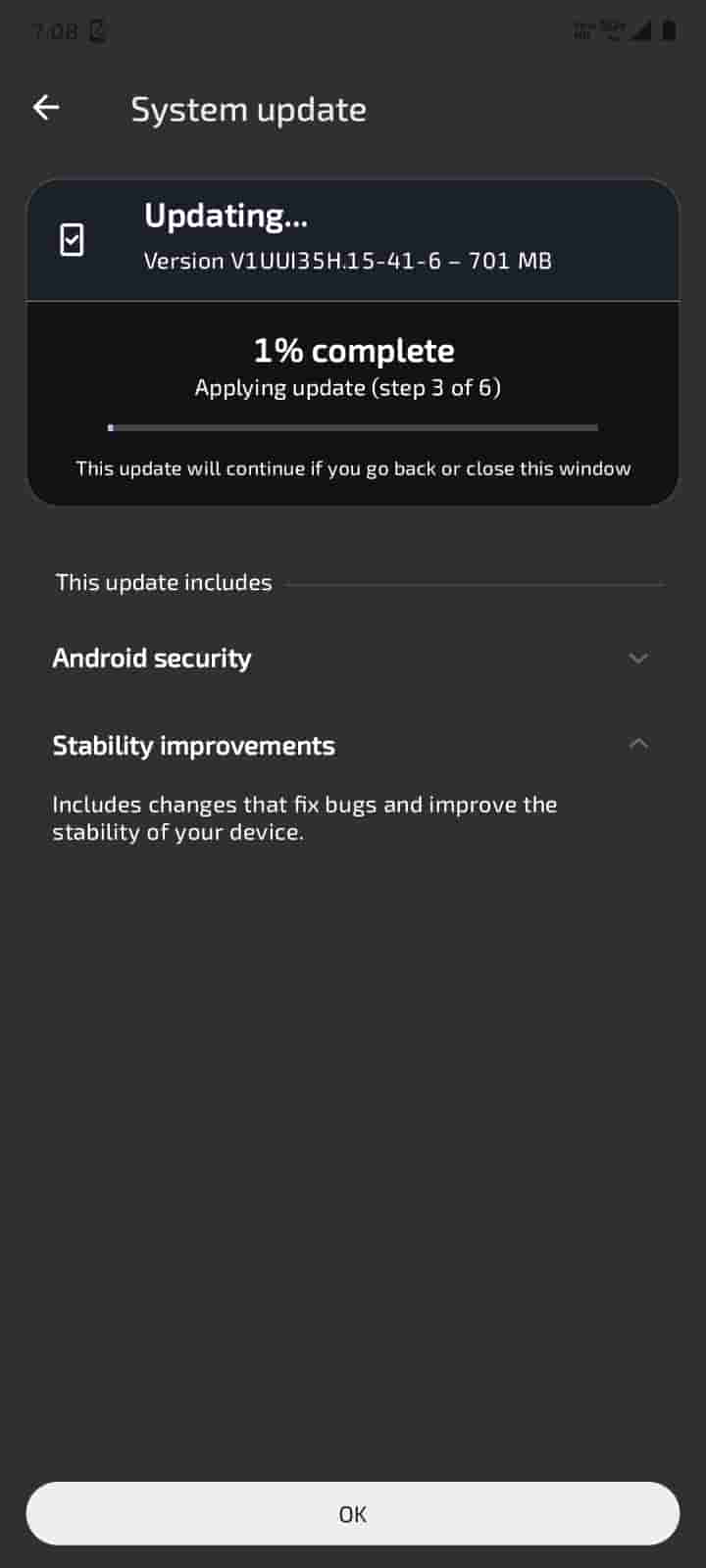 This update arrives with firmware version VIUU35H.15-41-6, and the size of the update is 701 MB.