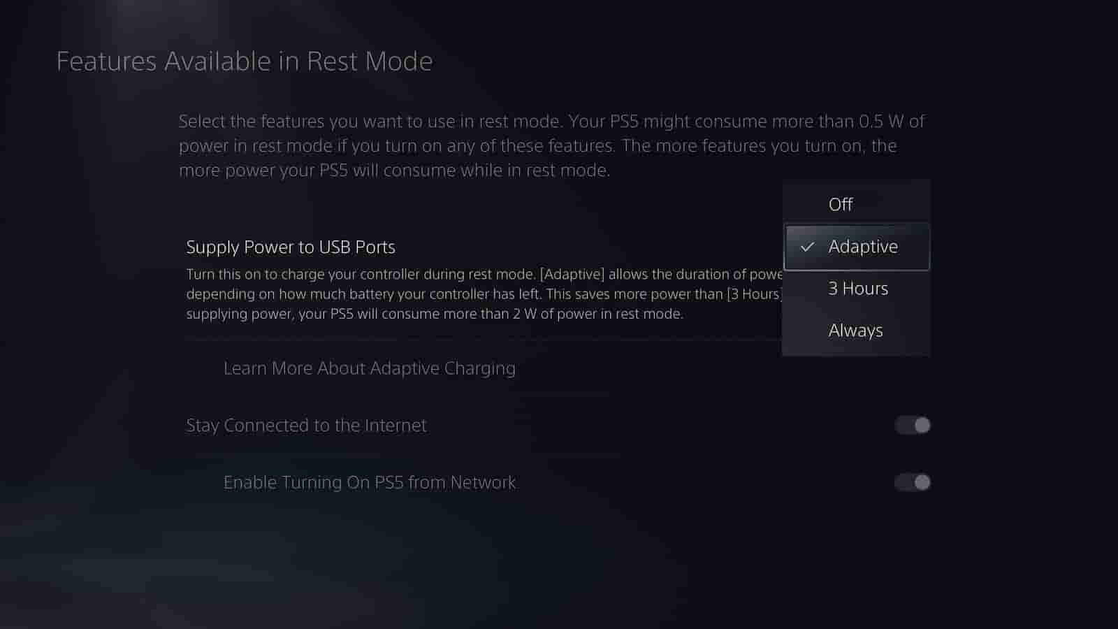 To use this feature, go to Settings>System>Power Saving> Features Available in Rest mode> Select Supply Power to USB ports> Adaptive. Do note that after your PS5 enters rest mode, if a controller isn’t connected, the power supply to the USB port will stop after a certain period.