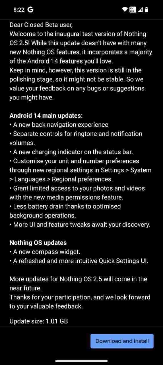 Selected Nothing Phone(2) users who registered for the Nothing OS 2.5 closed beta program just recently received the update. Users shared the screenshot of the update on a Telegram community group that showed Android 14 main updates and Nothing OS update. It also revealed that the update is 1.01 GB large.