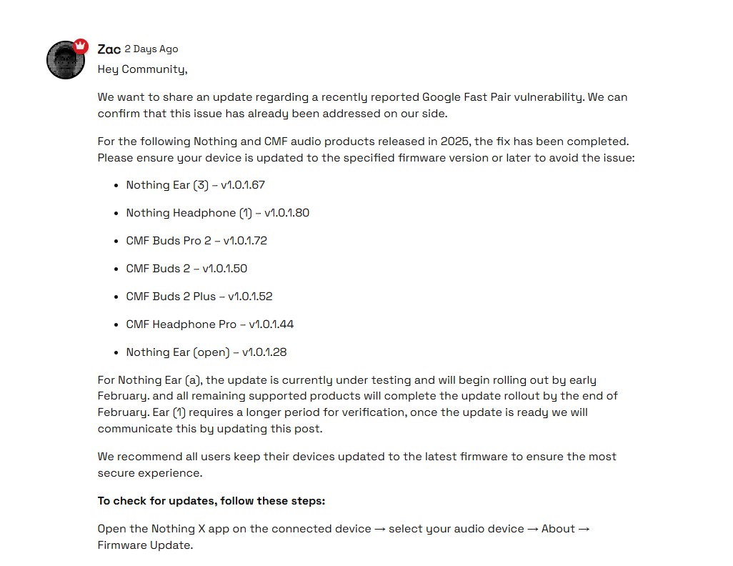 Nothing has also confirmed that it has fixed the vulnerability across several of its audio products. The details were shared by Zac, a community admin, in an official post on the Nothing Community page.