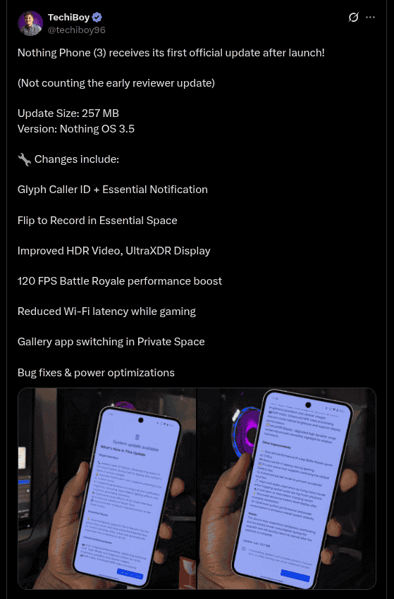 Previously, the Nothing Phone (3) smartphone did get an early reviewer update, however the Nothing OS 3.5 update that has now been rolled out is the first proper official update for the device. It has a total update size of 257MB, and the changelogs are with respect to the Glyph Interface, Essential Space, Camera, and more.