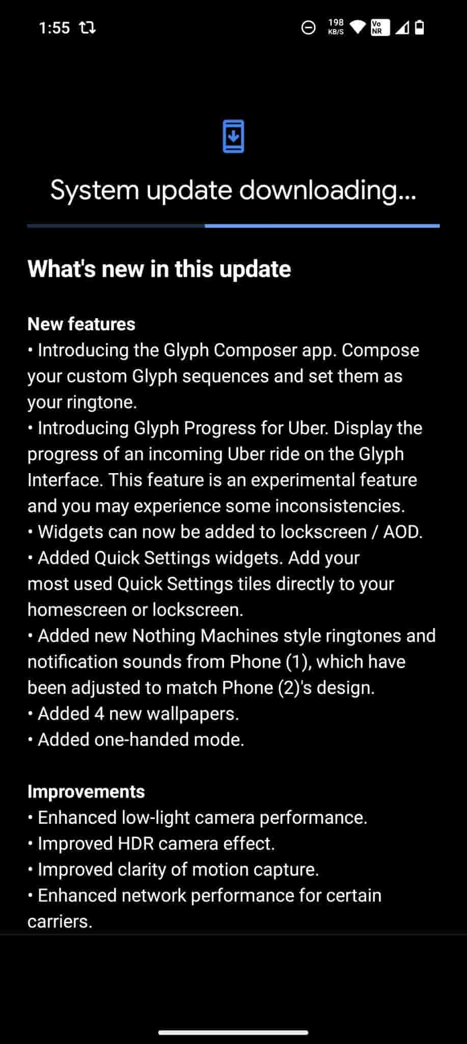 Mukul Sharma, a Twitter user, has shared the screenshot of the Nothing Phone(2) screen in which “System update downloading” can be seen with enlisted features, improvements, and Bug fixes.