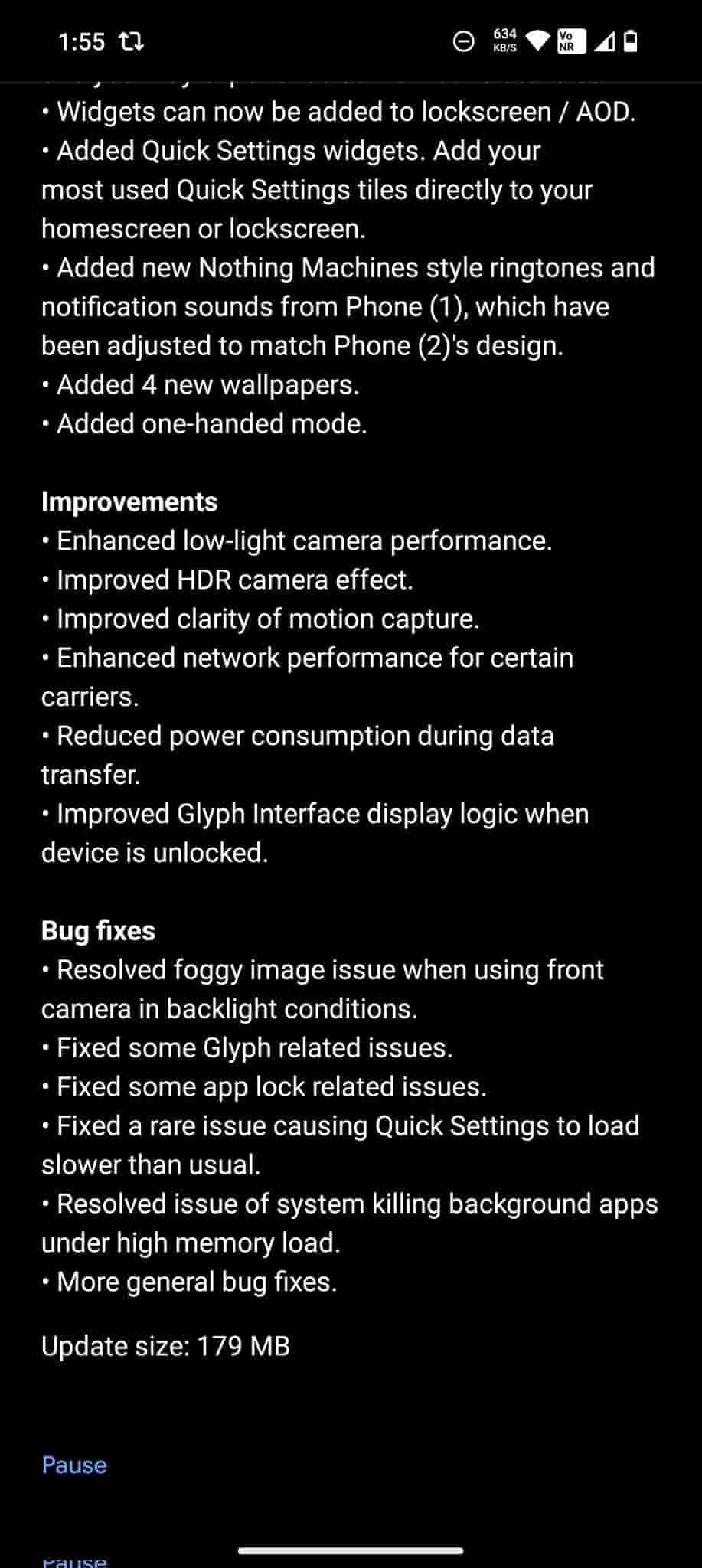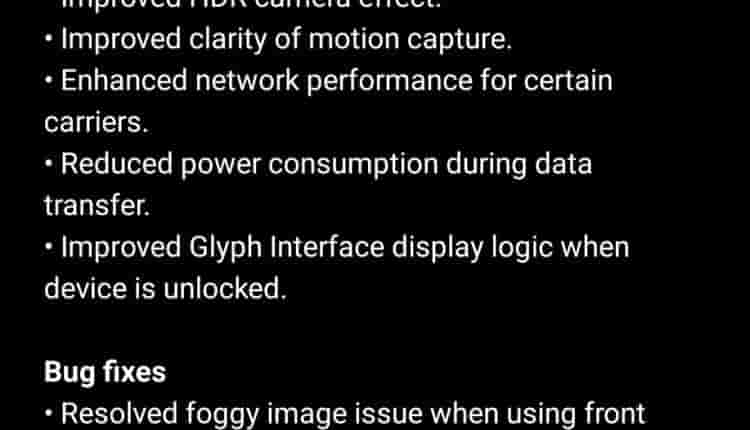 This System update makes sure to resolve foggy image issues when using the front camera in the backlight issue. App lock, Glyph, and Quick setting-related issues have also been resolved.