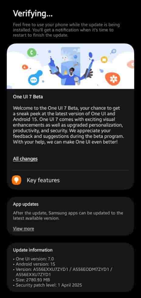 The beta build arrives with firmware version A556EXXU7ZYD1/ A556EODM7ZYD1/ A556EXXU7ZYD1. The size of the update is 2780.93MB and integrates the April 2025 security patch level.