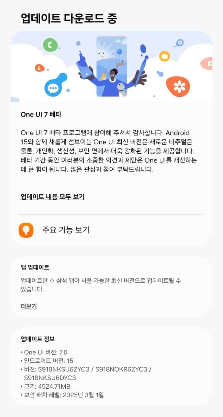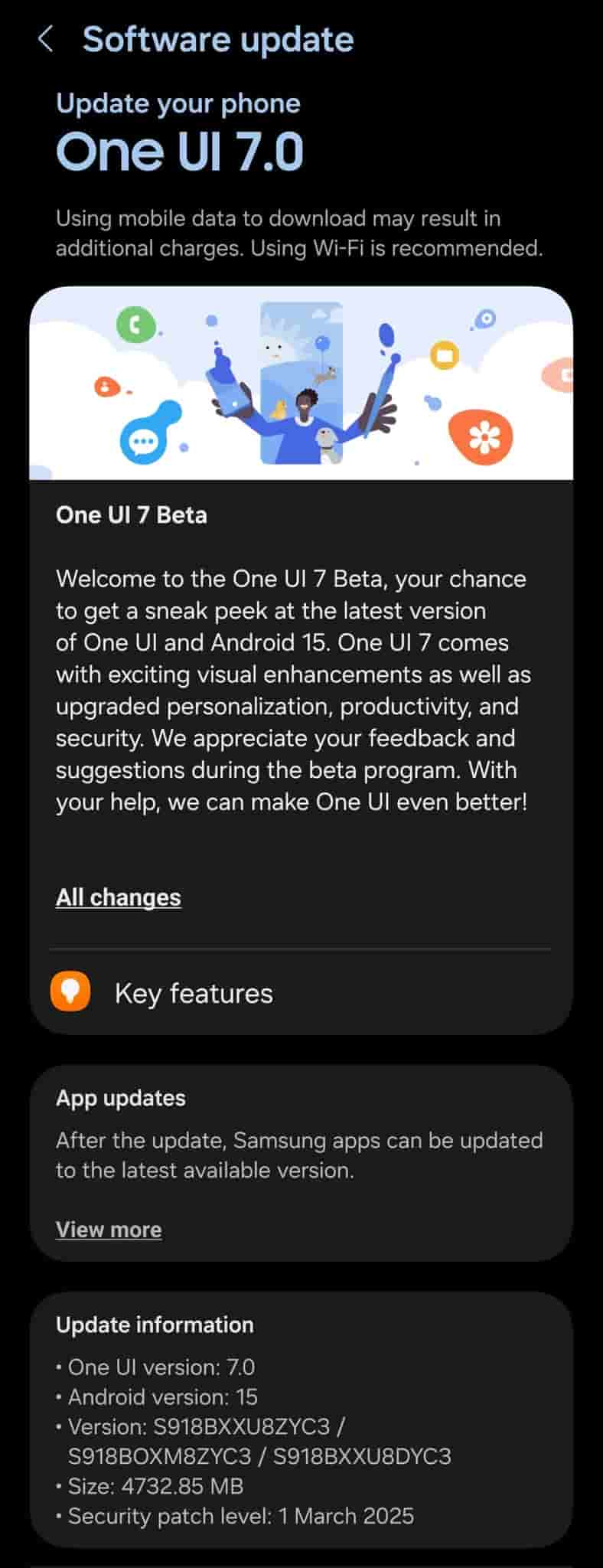 In South Korea, this One UI 7 beta update for the eligible Galaxy S23 series models has the firmware version of ‘S918NKSU6ZYC3 / S918NOKR6ZYC3 / S918NKSU6DYC3’. The update has a total size of 4524.71 MB. Also, the March 2025 Android security patch will be included in the beta update.