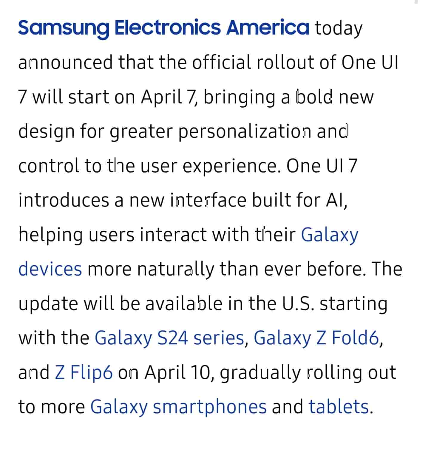 In US markets, the One UI 7 stable version will be rolled out a few days later. As officially announced by the brand One UI stable version will be rolled out in the US starting with the Galaxy S24 series, Galaxy Z Fold 6, and Galaxy Z Flip 6 on 10 April.