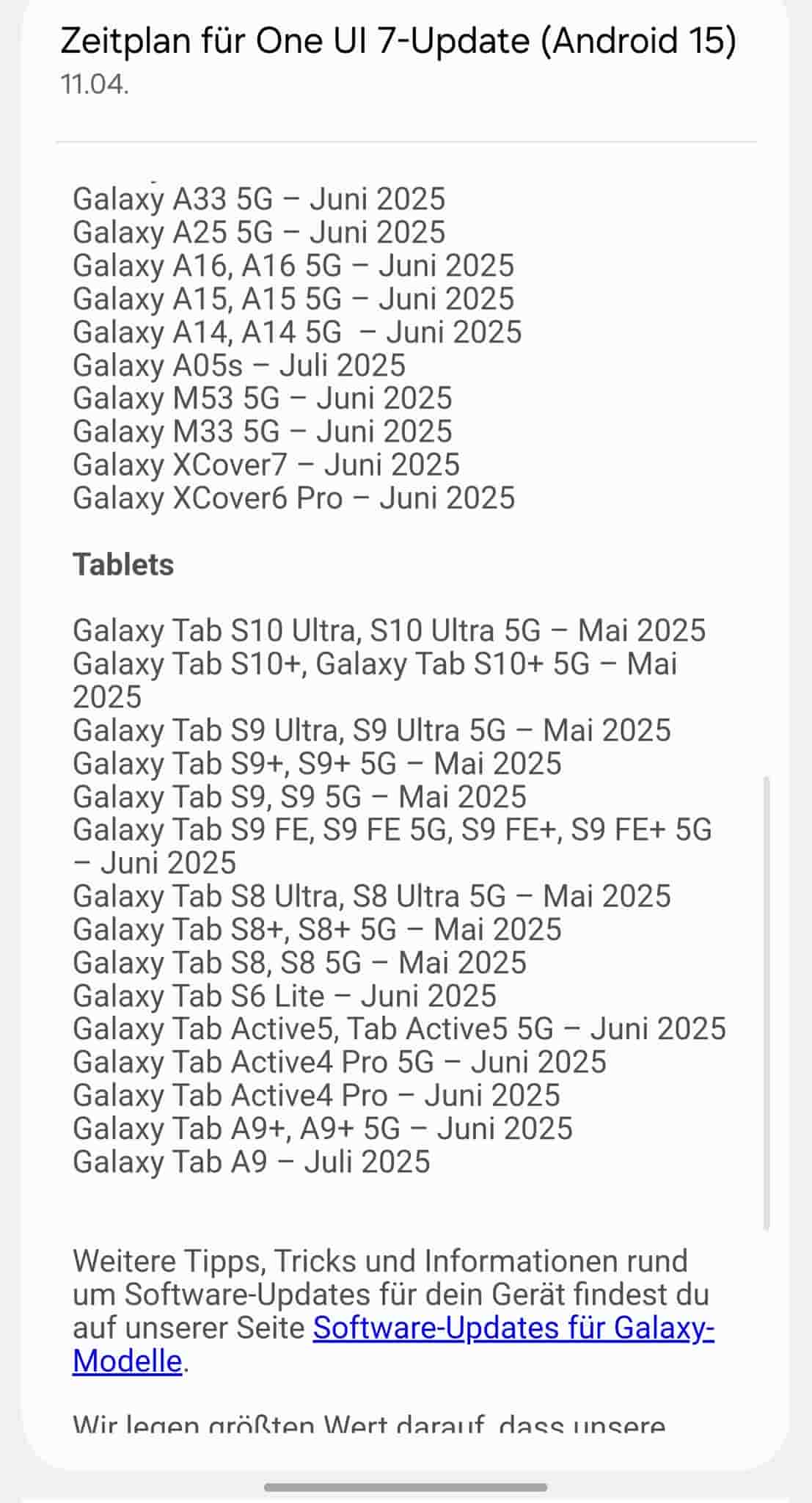 Following the roll-out to eligible flagship smartphone models, in June 2025, the One UI 7 stable version update will be made available to Galaxy A-series models such as the Galaxy A55, Galaxy A54, Galaxy A53, Galaxy A35, Galaxy A34, Galaxy A33, Galaxy A25, Galaxy A16 (4G and 5G), Galaxy A15 (4G and 5G), and Galaxy A14 (4G and 5G) as well as to Galaxy M-series devices which includes the Galaxy M53 and Galaxy M33. In the same month, the update will also be offered to the Galaxy XCover 7 and Galaxy XCover 6 Pro rugged smartphones too. Finally in July 2025, the Galaxy A05s smartphone users will be receiving it.