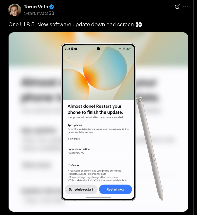 In the next One UI 8.5 custom skin that is expected to arrive early next year, Samsung Galaxy users can expect a revamped and refreshed design for the software download screen. From the previous design, the image has been switched to something new, and the whole layout is now re-aligned with the changelogs first, followed by the update information and warnings. Notably, it is now more spacious and neat when compared with the previous one.