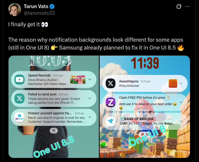 Coming to the notification background, in the Android 15-based One UI 8 custom, Samsung Galaxy users would have seen the notification background in the lock screen appearing more transparent, making it difficult to read the contents of the message against the wallpaper. As per the revealed image, this issue will be fixed in the One UI 8.5 custom, featuring opaque and neatly stacked notification badges.