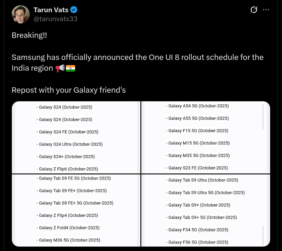 One UI 8 Roll-Out Schedule for More Samsung Galaxy Devices Officially Announced in India: Roll-Out Starting Next Month in October 2025
