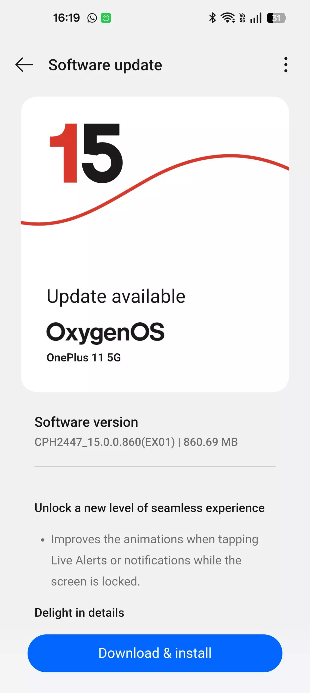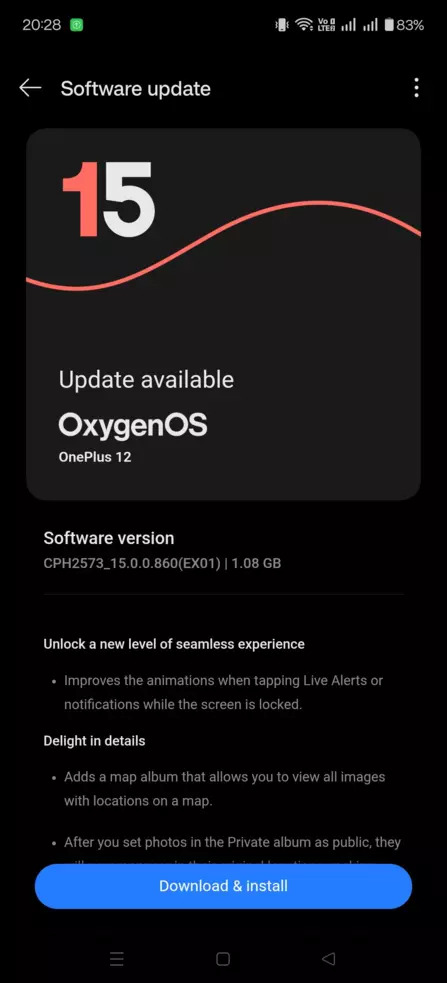 For the OnePlus 11, the update is being rolled out with version number IN: CPH2447_15.0.0.860(EX01), while the OnePlus 12 is receiving it with version number IN: CPH2573_15.0.0.860(EX01). The size of the update package differs slightly between the two devices — it is 860.69 MB for the OnePlus 11 and 1.08 GB for the OnePlus 12 — even though both smartphones are receiving the same update.