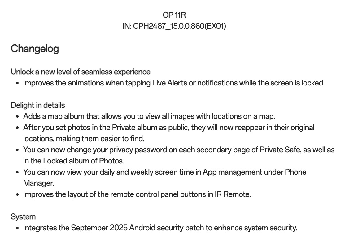 OnePlus 11R IN: CPH2487_15.0.0.860(EX01) Changelog