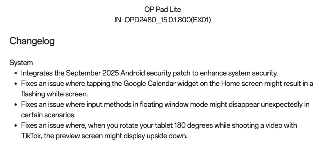 OnePlus Pad Lite IN: OPD2480_15.0.1.800(EX01) Changelog