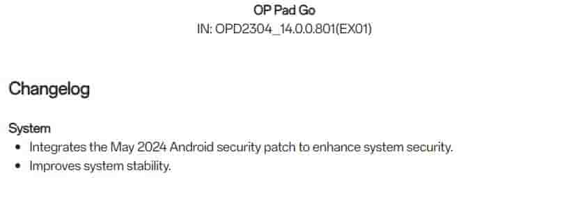 This update carries a firmware version IN: OPD2304_14.0.0.801(EX01) and integrates the May 2024 security patch update. Also, it will improve the overall system stability.
