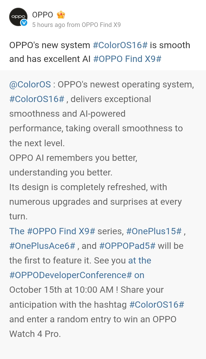 The OPPO Find X9 series (which will consist of the OPPO Find X9 and the OPPO Find X9 Pro flagships) that is also scheduled to launch next month in October 2025 will be the first to feature the ColorOS 16 custom skin. Additionally, the OnePlus 15, OnePlus Ace 6, and the OPPO Pad 5 are also revealed to be among the first products to come with the Android 16-based ColorOS 16 custom skin out of the box.