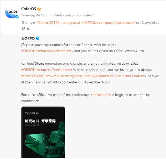 OPPO has now officially confirmed that the brand will be unveiling its ColorOS 14 custom skin at the developer conference event scheduled to take place at the Shanghai World Expo Center in China on the 16th of November 2023, next month.