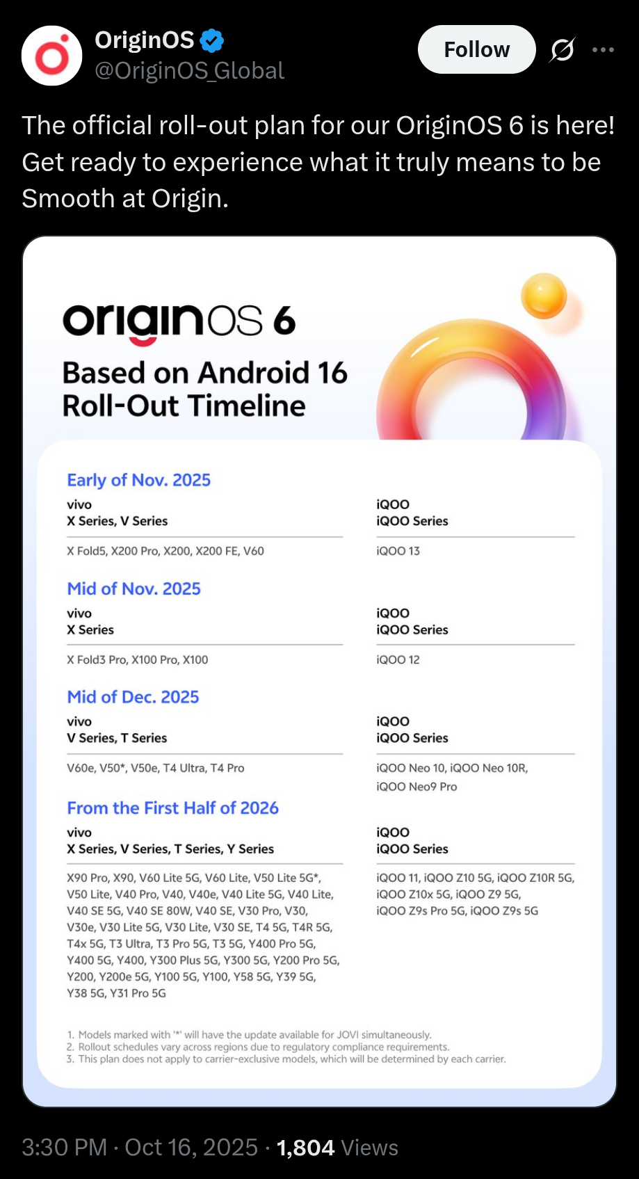 OriginOS 6 Official Global Roll-Out Plan Shared: Rolling Out From Next Month in November 2025