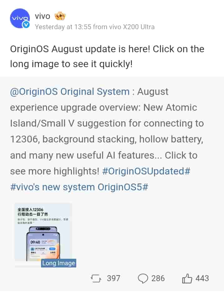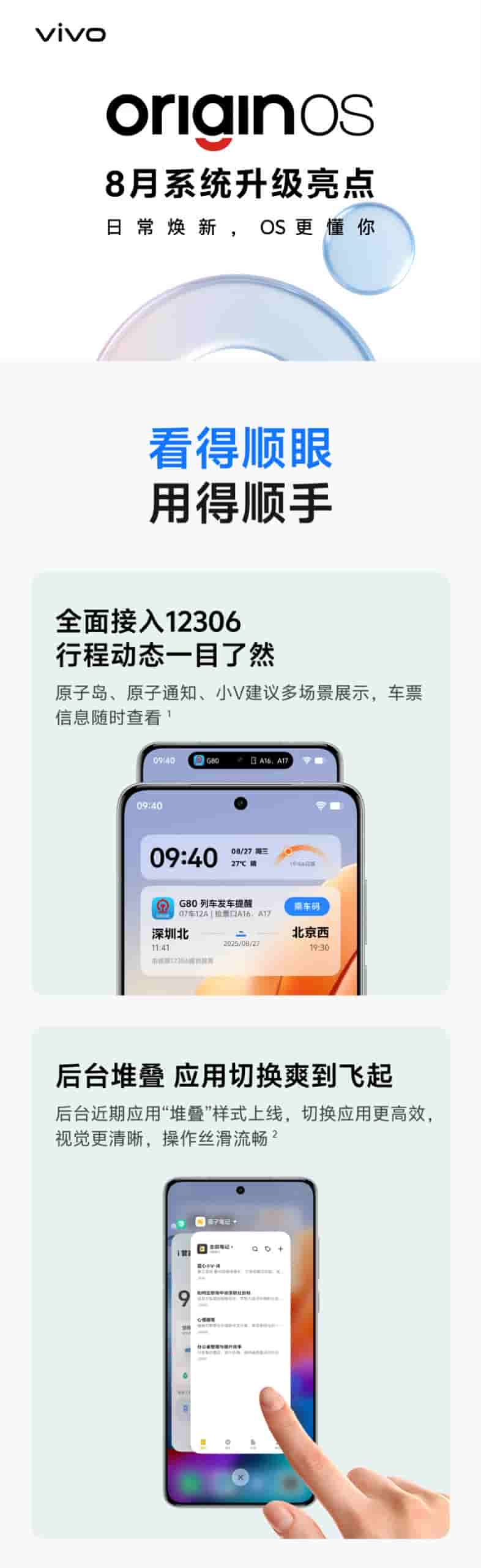 With the latest August 2025 update that has now been released in China, the OriginOS custom skin of Vivo has received certain key upgrades and it has now been made to understand its users even better. With the 12306 full integration, the itinerary dynamics are made clearer, and the Atomic Island, Atomic Notification, and Xiao V Suggestion are displayed in multiple scenes and can be viewed at a single glance. The background application stack style will also be made live to users with the August 2025 update, enabling users to have a better user experience while switching between apps.
