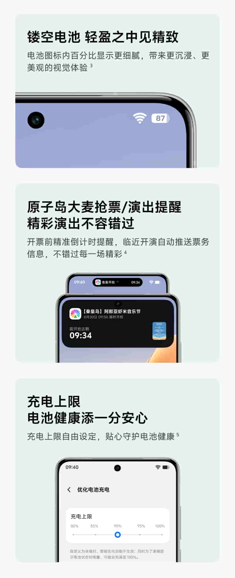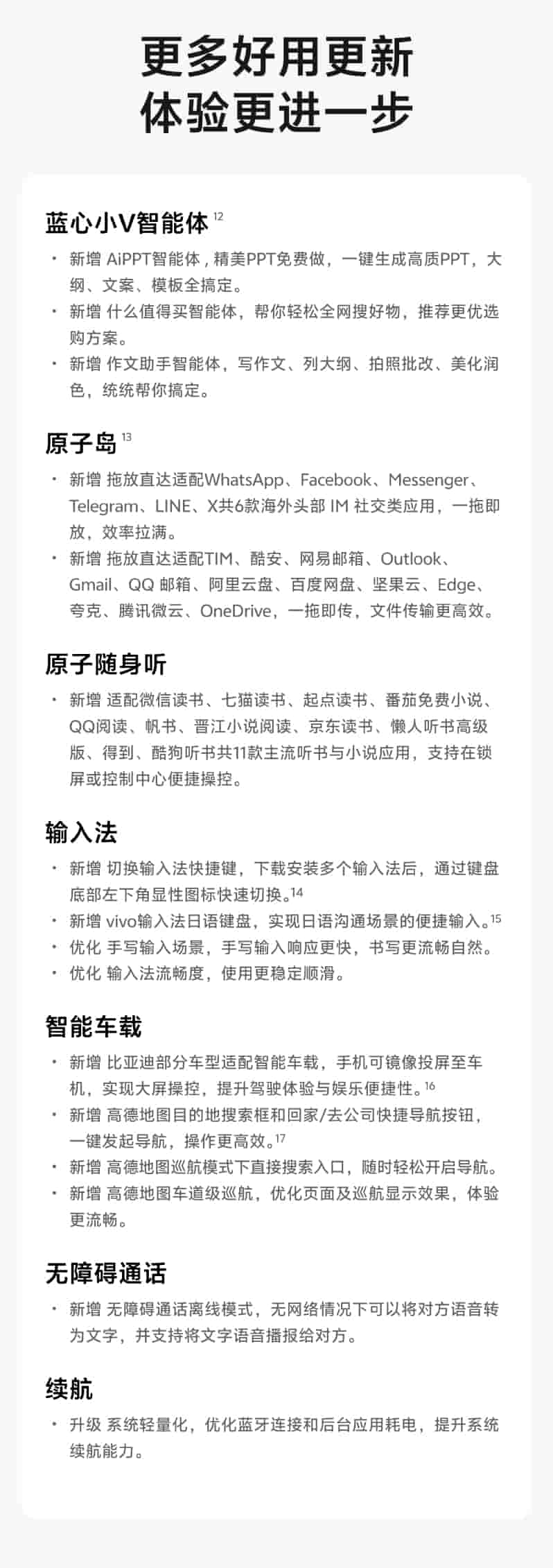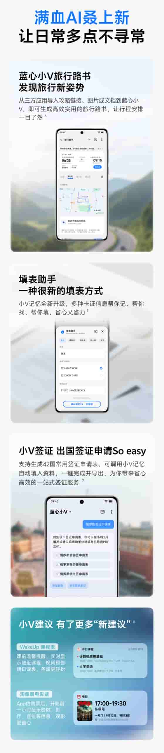 For a better visual appearance, the battery percentage is brought inside the battery icon. An accurate countdown reminder is also part of the update, as well as a charging limit to protect battery health. On the AI side, importing guide links and pictures/documents to Lanxin Xiao V from other third party applications, Form Filling Assistant to remember things, and Xiao V Visa Overseas visa application have been added. Wake Up Class Schedule and Tao Piaopiao movie tickets are other AI related features that have been introduced.