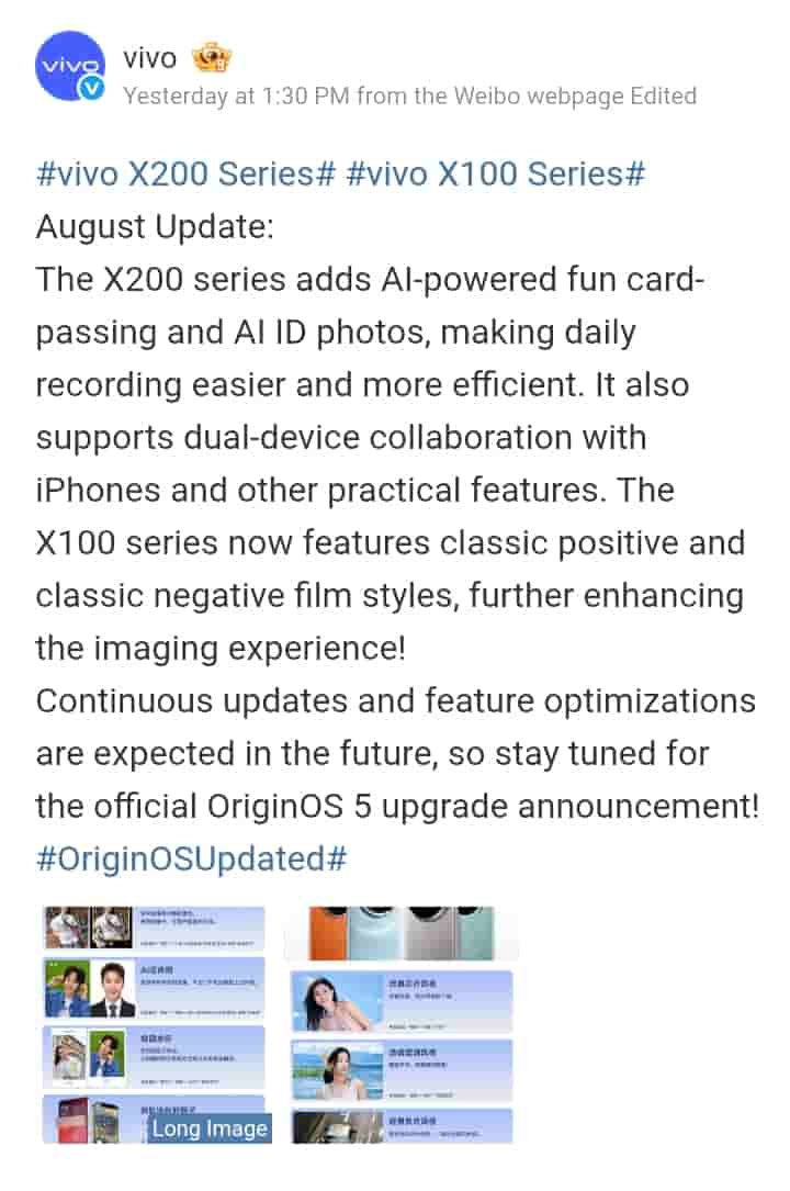About the roll-out schedule, it has now been made live, and will reach all eligible OriginOS 5 users by mid-September 2025. As mentioned, Vivo’s X200 series (X200, X200 Pro mini, X200 Pro, X200s, X200 Ultra) and X100 series (X100, X100 Pro, X100s, X100s Pro, X100 Ultra) flagship users have already received it. Notably, Vivo has also made a few added AI and camera features too available to its X200 series and X100 series smartphone users.