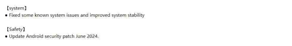 This update includes fixes for known system issues and will improve overall system stability. It will also integrate the June 2024 Android security patch. Other than this, no major feature upgrades are included in this update.