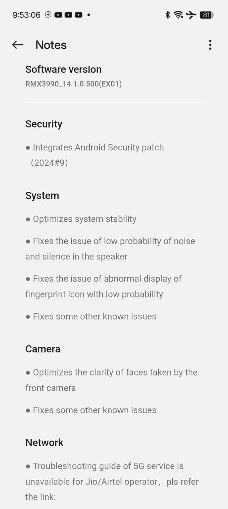 This update arrives with software version RMX3990_14.1.0.500(EX01). This update includes the September security patch and also some bug fixes.