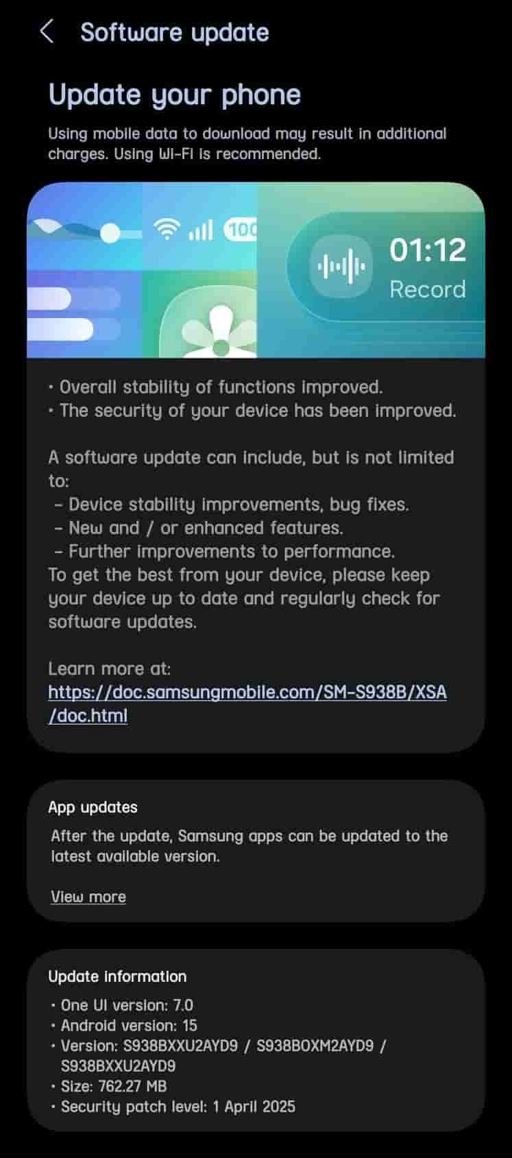 The screenshots below are for the Galaxy S25 Ultra model (via @tarunvats33). The update arrives with firmware version S938BXXU2AYD9/ S938BOXM2AYD9/ S938BXXU2AYD9 in Australia and India. The size of the update is 762.27 MB.