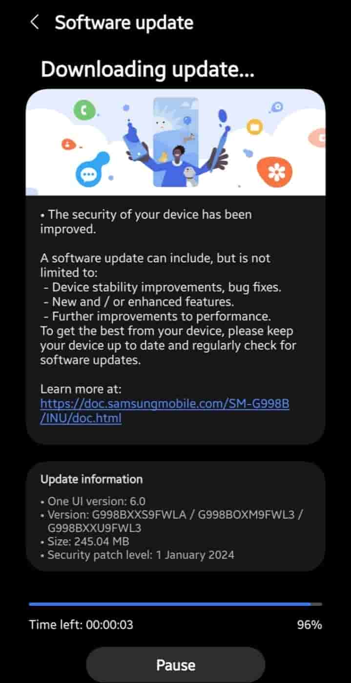 This latest update arrives with firmware version: G998BXXS9FWLA/ G998BOXM9FWL3/ G998BXXU9FWL3. The size of this update is 245.04MB. This latest update integrates the January 2024 security patch to the device in order to enhance system stability. Other than that the update includes no major changes or improvements.