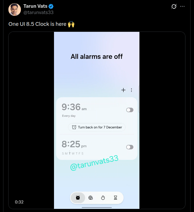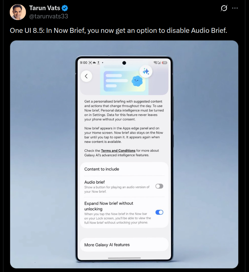 As mentioned, with the One UI 8.5 custom skin, a new Audio Brief disable option is being added to Now Brief. With this option, users can choose whether or not to play the audio version of Now Brief. Additionally, UI changes are also being brought to the Calendar, Reminder, and Clock apps. A gradient White x Blue theme has been followed throughout the design, with menu boxes having rounded corners and other thematic elements.