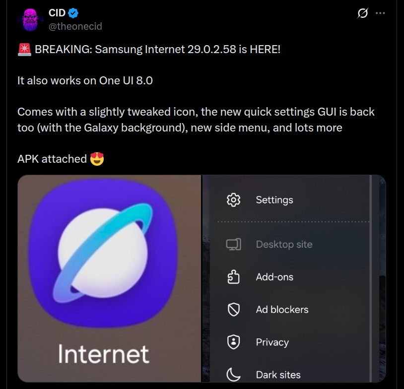 In related news, Samsung has also released the version 29.0.2.58 of the Internet app, and it works with the One UI 8.0 custom skin based on the Android 16 operating system. Regarding the changes, the app icon has received some slight tweaks, and the brand has added the new quick settings GUI along with the Galaxy background. The new side menu is also part of the latest app version, and it brings many other more features as well. Interested users can download this app version via the attached APK file.