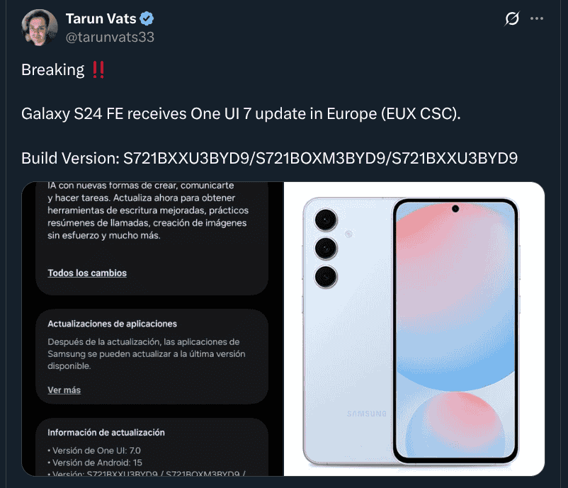 In the European market (EUX CSC), the Android 15 based One UI 7 official update for the Galaxy S24 FE is now rolling out. The update has the firmware build version of ‘S721BXXU3BYD9 / S721BOXM3BYD9 / S721BXXU3BYD9’, and has a total size of 5177 MB. Also to add, the update will be integrating the latest April 2025 Android security patch onto the device.