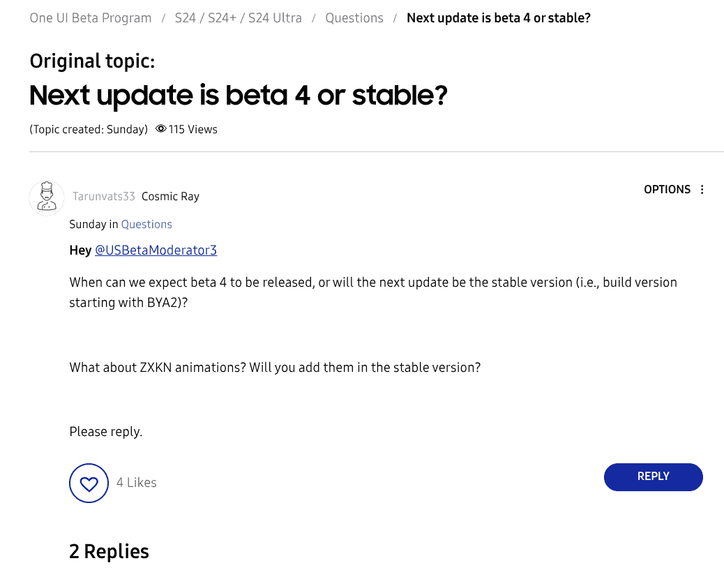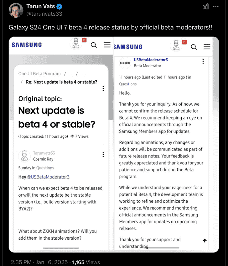 It is to the tipster @tarunvats33‘s query posted on the Samsung community platform(US) concerning the beta 4 expected release date that the beta moderators have shared the release status. Based on the official update, it is now confirmed that there is indeed a One UI 7 beta 4 version in works and that the next update won’t be the stable version update (for the Galaxy S24 series).