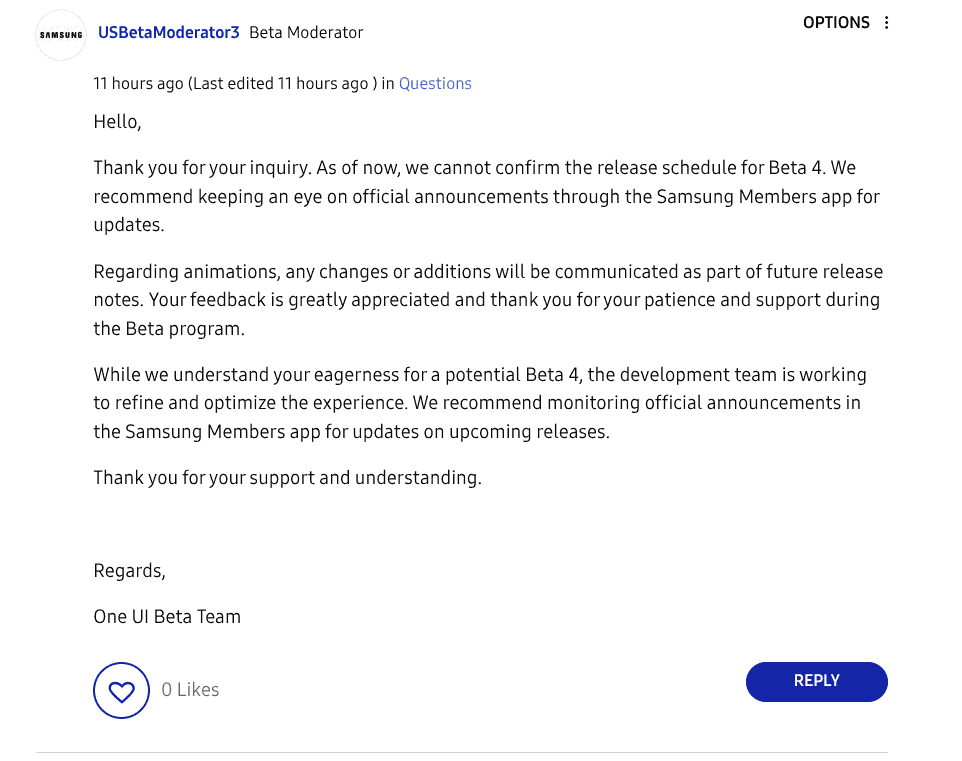 It has been further added that the development team is currently working on the One UI 7 beta 4 version, refining and optimizing the user experience, therefore the release schedule cannot be confirmed yet. The official update regarding the release is suggested to be shared via the Samsung Members app, and the beta moderators have asked to keep a keen eye on the official announcements.