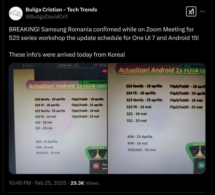 As mentioned above, these details were shared by Samsung Romania in a Zoom meeting for the Galaxy S25 series, and it has been pointed out that the Galaxy S24 series (Galaxy S24, Galaxy S24+. Galaxy S24 Ultra, & Galaxy S24 FE) and Galaxy Z6 series (Galaxy Z Fold 6 & Galaxy Z Flip 6) will possibly be receiving the One UI 7 official version update on the 18th of April 2025. On the 25th of April 2025, it is expected to be rolled out to the Galaxy S23 series (Galaxy S23, Galaxy S23+, & Galaxy S23 Ultra), Galaxy Z5 series (Galaxy Z Fold 5 & Galaxy Z Flip 5), and Galaxy A54 devices.