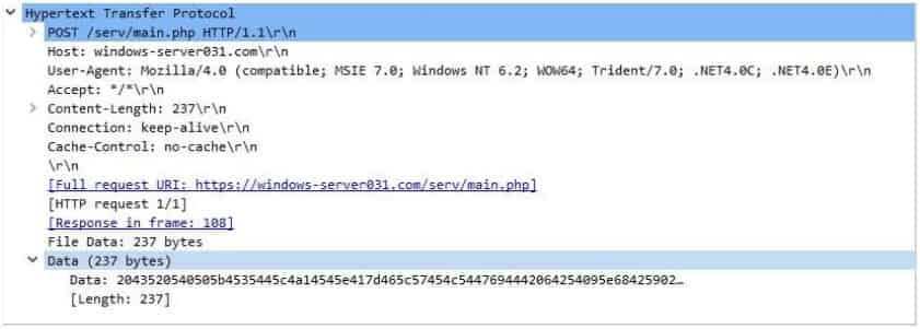 All stolen data is copied to the user’s temporary directory through a PowerShell command, encrypted, and then sent to the operator’s command and control server (“windows-server031.com”).
