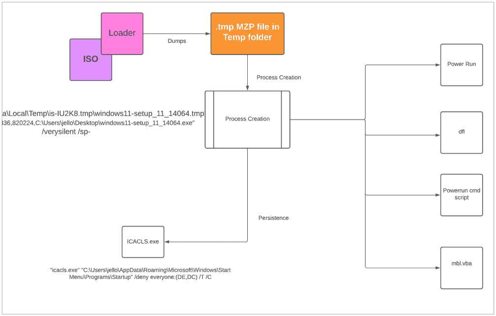 Persistence is achieved by placing a.LNK (shortcut) file in the Startup directory and setting its access rights with icacls.exe.