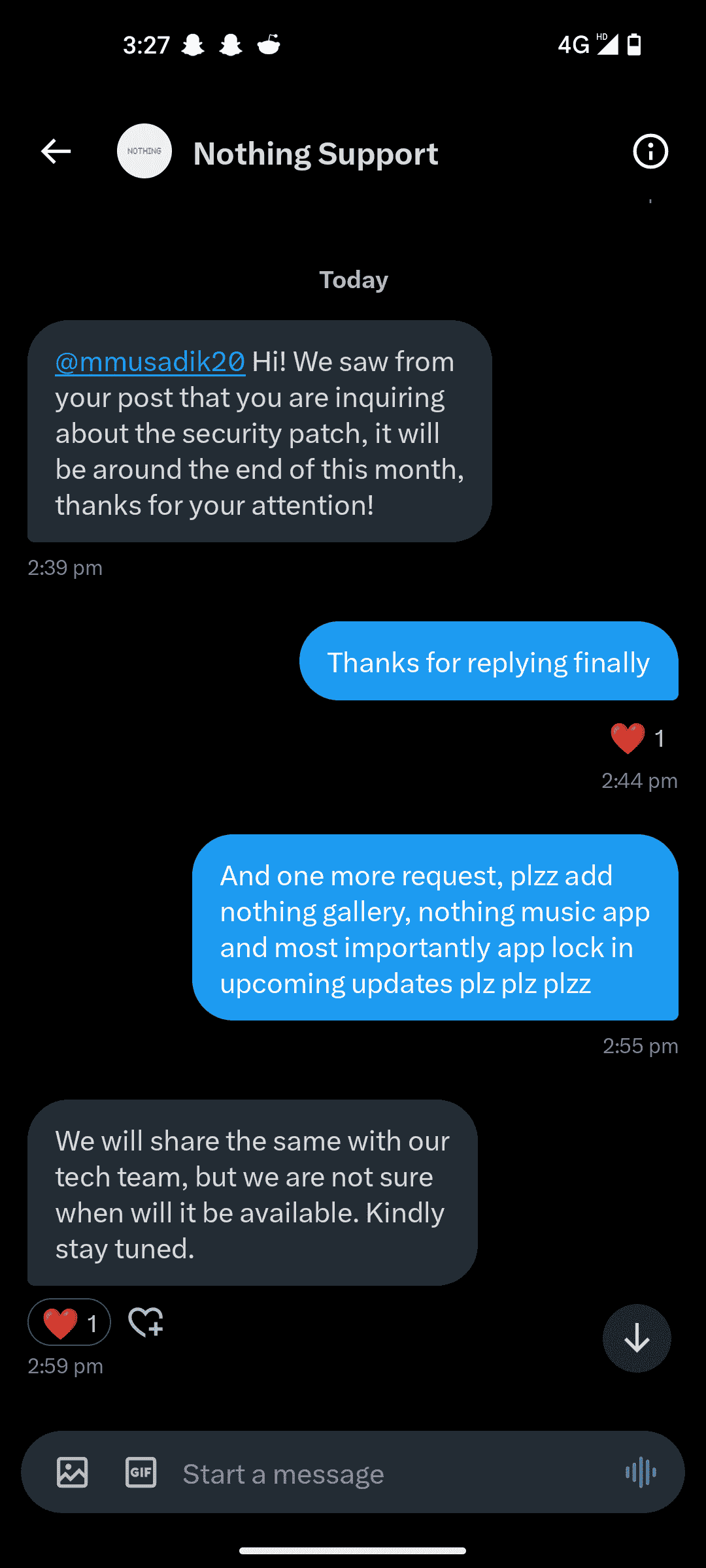 However, today as per a Reddit post in which the user shared a screenshot of what looks like him chatting with a nothing chat rep. In the shared conversation, screengrab we can clearly see the Nothing support rep stated that there might be a security patch update by the end of this month. The user then made a request to add Nothing Gallery, Nothing Music App, and App Lock in the coming updates. The support rep replied that they would pass on the request to the team, but they were unsure when the updates would be available.
