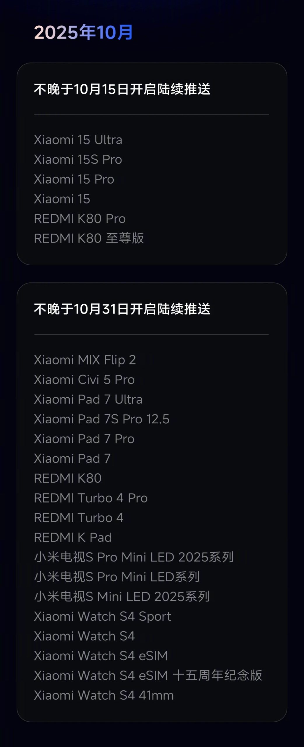 For Xiaomi 15 Ultra, Xiaomi 15S Pro, Xiaomi 15 Pro, Xiaomi 15, Redmi K80 Pro, and the Redmi K80 Pro, the HyperOS 3 will be rolled out before the 15th of October 2025. Prior to the 31st of October 2025, the Xiaomi Mix Flip 2, Xiaomi Civi 5 Pro, Xiaomi Pad 7 Ultra, Xiaomi Pad 7S Pro 12.5, Xiaomi Pad 7 Pro, Xiaomi Pad 7, Redmi K80, Redmi Turbo 4 Pro, Redmi Turbo 4, Redmi K Pad, Xiaomi TV S Pro Mini LED 2025 series, Xiaomi TV S Pro Mini LED series, Xiaomi TV S Mini LED 2025 series, Xiaomi Watch S4 Sport, Xiaomi Watch S4, Xiaomi Watch S4 eSIM, Xiaomi Watch S4 eSIM 15th Anniversary Edition, and Xiaomi Watch S4 41mm device will be getting it.