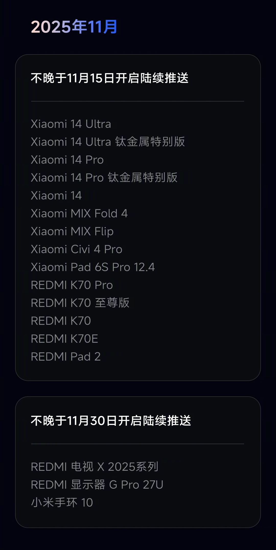 In November 2025, more older devices such as the Xiaomi 14 Ultra, Xiaomi 14 Ultra Titanium Special Edition, Xiaomi 14 Pro, Xiaomi 14 Pro Titanium Special Edition, Xiaomi 14, Xiaomi Mix Fold 4, Xiaomi Civi 4 Pro, Xiaomi Pad 6S Pro 12.4, Redmi K70 Pro, Redmi K70 Ultra, Redmi K70, Redmi K70E, and the Redmi Pad 2 will be offered the HyperOS 3 custom skin before the 15th of November 2025. Afterward in the same month, before 30th of November 2025, the Redmi TV X 2025 series, Redmi Monitor G Pro 27U, and the Xiaomi Mi Band 10 will receive the latest custom skin.