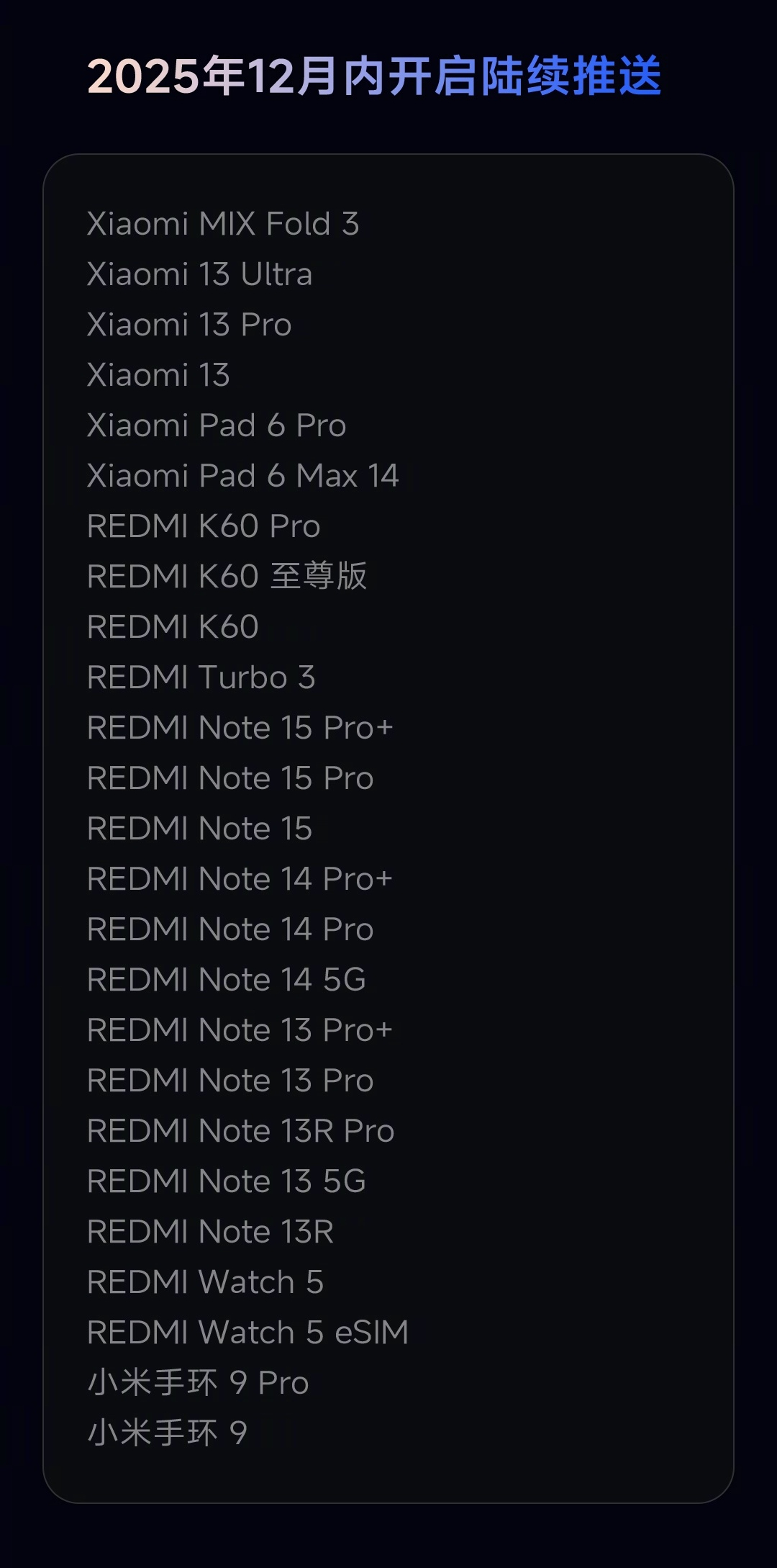 The Xiaomi Mix Fold 3, Xiaomi 13 Ultra, Xiaomi 13 Pro, Xiaomi 13, Xiaomi Pad 6 Pro, Xiaomi Pad 6 Max 14, Redmi K60 Pro, Redmi K60 Ultra, Redmi K60, Redmi Turbo 3, Redmi Note 15 Pro+, Redmi Note 15 Pro, Redmi Note 15, Redmi Note 14 Pro+, Redmi Note 14 Pro, Redmi Note 14 5G, Redmi Note 13 Pro+, Redmi Note 13 Pro, Redmi Note 13R Pro, Redmi Note 13 5G, Redmi Note 13R, Redmi Watch 5, Redmi Watch 5 eSIM, Xiaomi Mi Band 9 Pro, and the Xiaomi Mi Band 9 will get the Xiaomi HyperOS 3 update in December 2025.