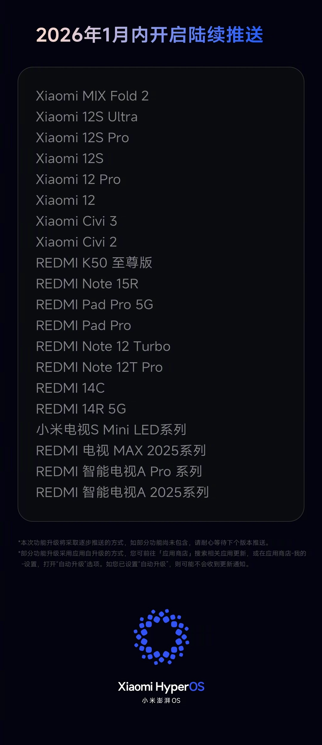 Finally, early next year in January 2026, Xiaomi’s HyperOS 3 update will be offered to the Xiaomi Mix Fold 2, Xiaomi 12S Ultra, Xiaomi 12S Pro, Xiaomi 12S, Xiaomi 12, Xiaomi Civi 3, Xiaomi Civi 2, Redmi K50 Ultra, Redmi Note 15R, Redmi Pad Pro 5G, Redmi Pad Pro, Redmi Note 12 Turbo, Redmi Note 12T Pro, Redmi 14C, Redmi 14R 5G, Xiaomi TV S Mini LED series, Redmi TV Max 2025 series, Redmi Smart TV A Pro series, and the Redmi Smart TV A 2025 series devices.